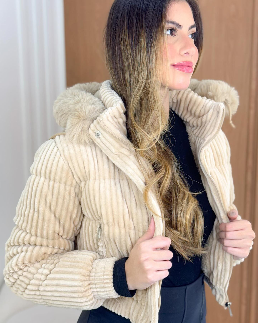 Com fechamento em zíper e botões, bolsos com zíper na parte frontal e capuz com forro em pelúcia, a peça garante praticidade, charme e conforto. Os detalhes metálicos dourados completam o visual com sofisticação.