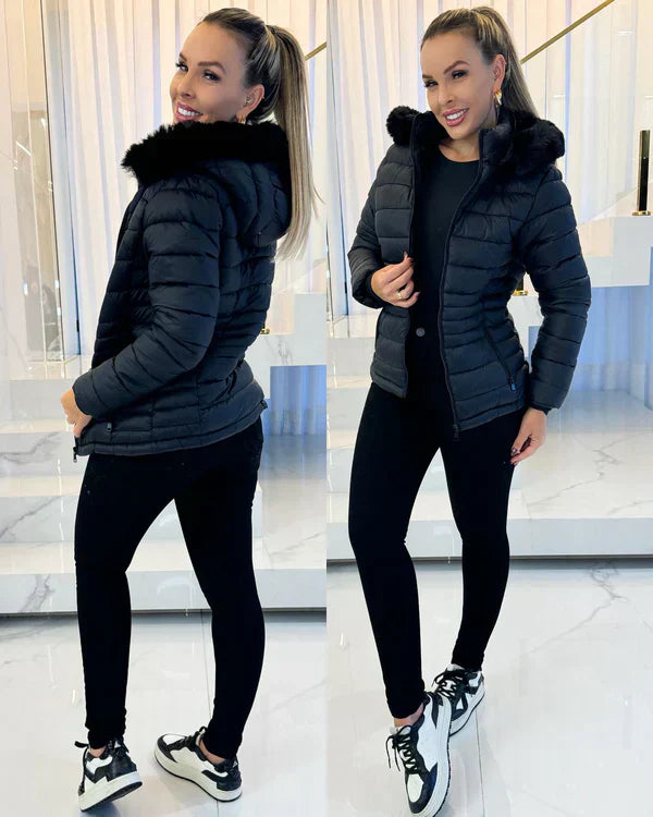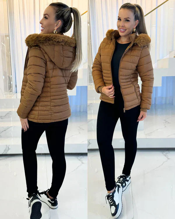 Com fechamento em zíper, bolsos frontais e capuz removível com pelinhos, ela une funcionalidade e beleza em uma peça única.